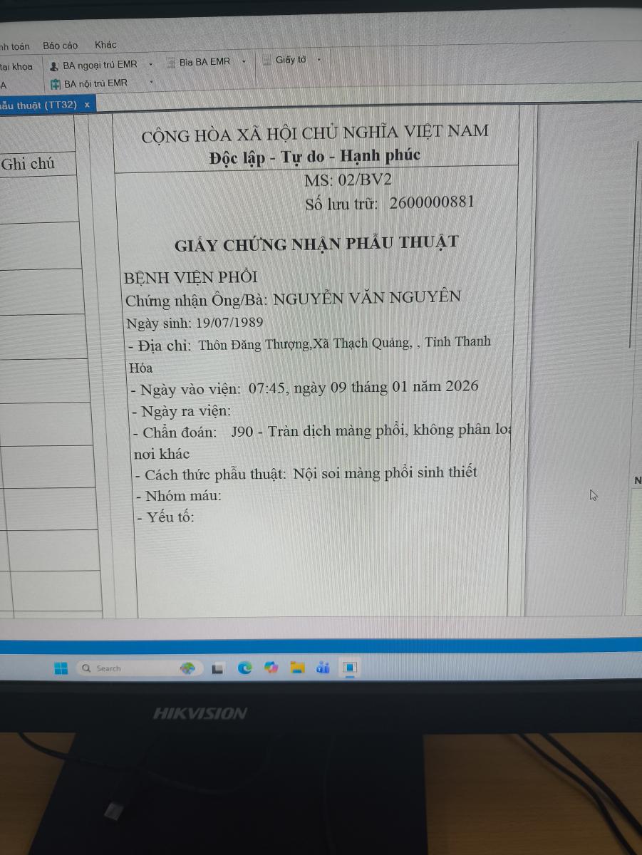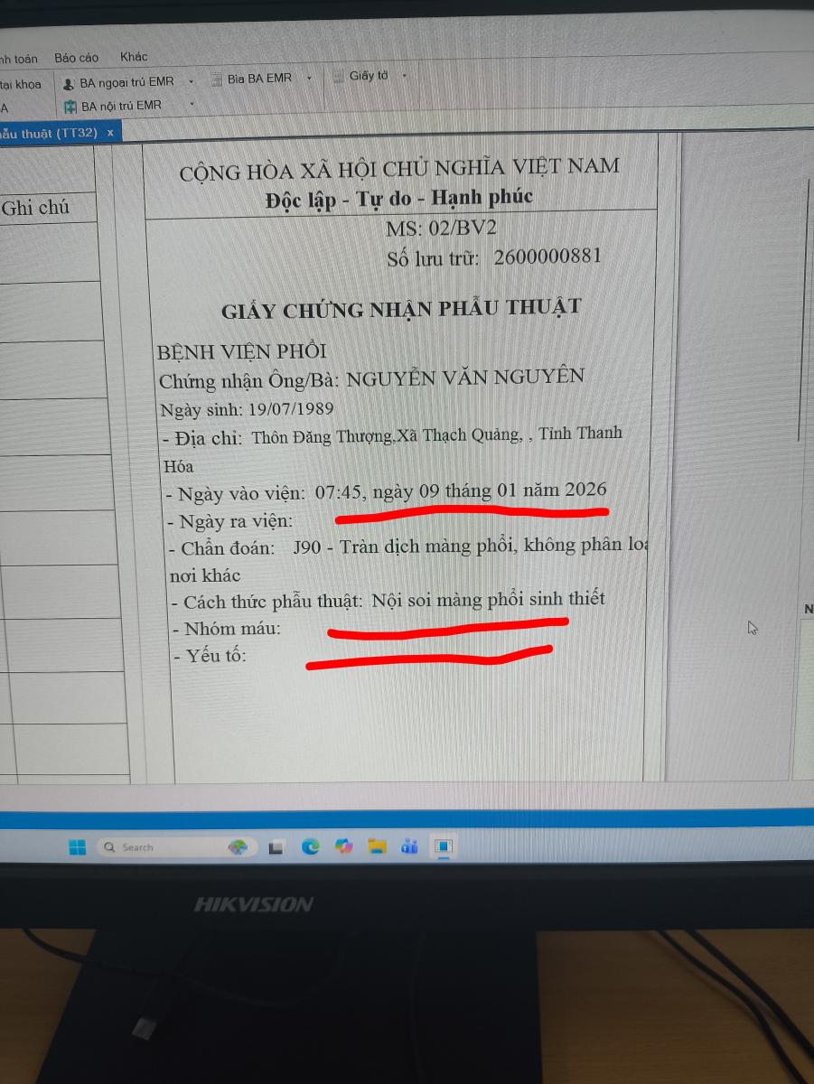 Bổ sung và chỉnh sửa giấy chứng nhận phẫu thuật cho BN . Đã liên hệ nhiều lần mà chưa xử lí.